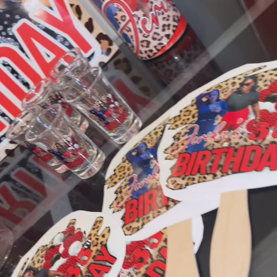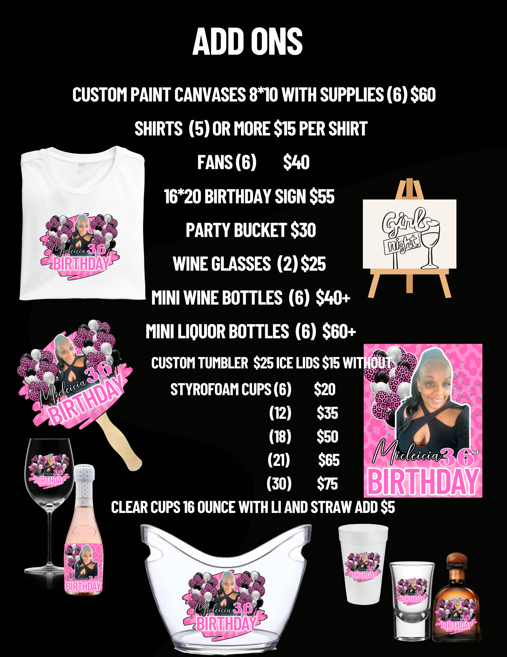 *Bad and Boujee Bucket: 12 Foam Cups, 12 Shot Glasses, 6 Wine Glasses, 12 Fans. One Sign, One Bucket, One Birthday Shirt